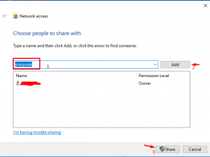 - Setelah klik tombol share pastikan dulu user yang menerima file sharing Anda, kalian pilih type user account yang dapat mengakses folder. Pada contoh ini kami memilih everyone agar semua user dapat mengakses folder. Klik tombol “Add” untuk menambahkannya ke list kemudian klik tombol “share”.