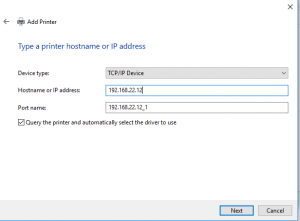 - Setelah itu di ” Device Type ” pilih ” TCP/IP device, kemudian masukan IP : 192.168.22.12 lalu klik next