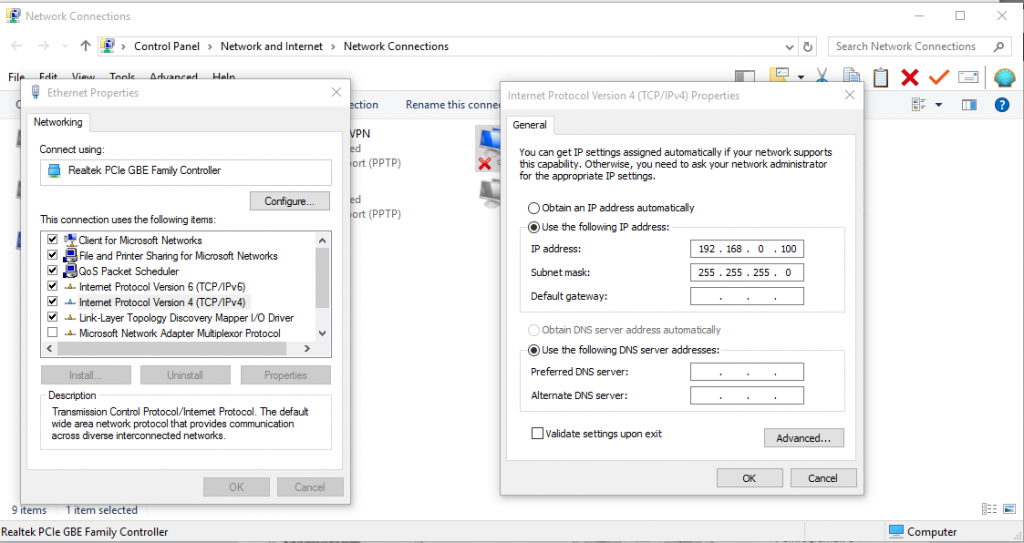 5. Masukan IP Address 192.168.0.100 (atau angka lebih besar dari 100), dan Subnet Mask menjadi 255.255.255.0